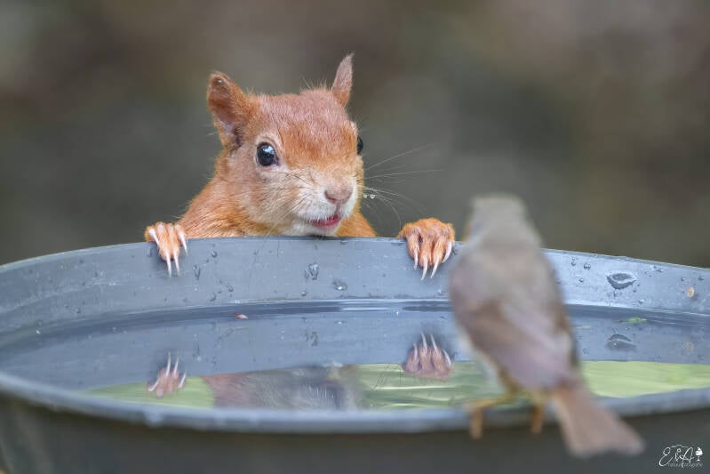 De drinkensbak voor de dieren wordt ook al goed gebruikt. Al is het voor sommige vogels soms even schrikken als blijkt dat je niet de enige bent die een slok komt nemen.