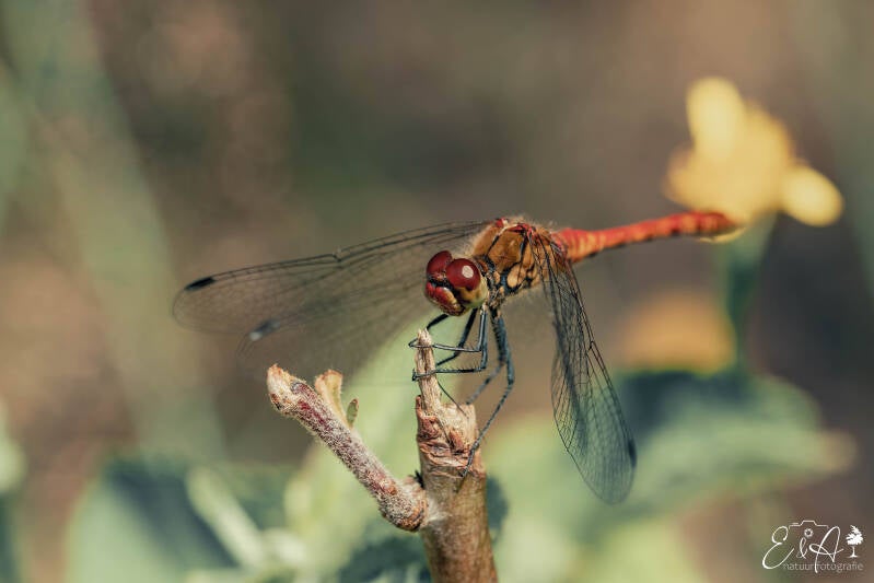 - Mannetje: achterlijf met duidelijke knotsvormige verbreding aan het uiteinde. Achterlijf in zijaanzicht met zwarte streepjes, soms met elkaar verbonden. Uitgekleurde mannetjes hebben een bloedrood achterlijf, een vrij egaal roodbruin borststuk, roodbruine ogen, een rood gezicht en roodbruine pterostigma’s. Jonge mannetjes zien eruit als vrouwtjes.