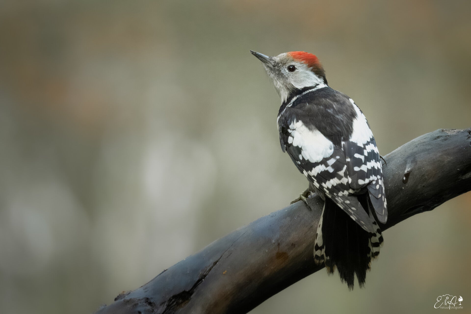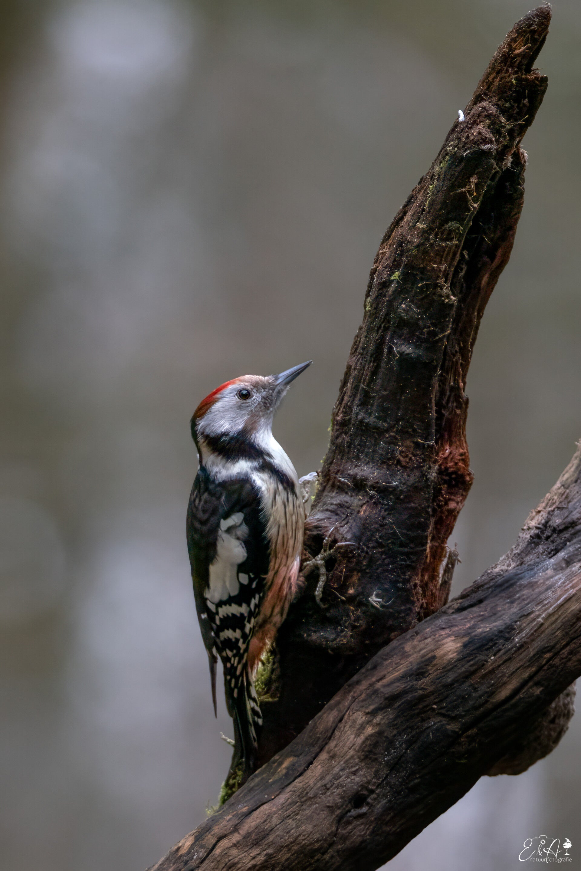 Lijkt op de grote bonte specht maar iets kleiner. Wit gezicht met in wit geïsoleerd oog. Rode pet in alle kleden, niet afgezet aan onderzijde met zwart. Zalmroze 'broek', flankstreepjes. Zwart-witte vleugels met grote witte schoudervlek. Wat verwarrend kan werken met nog niet volwassen grote bonte spechten.
