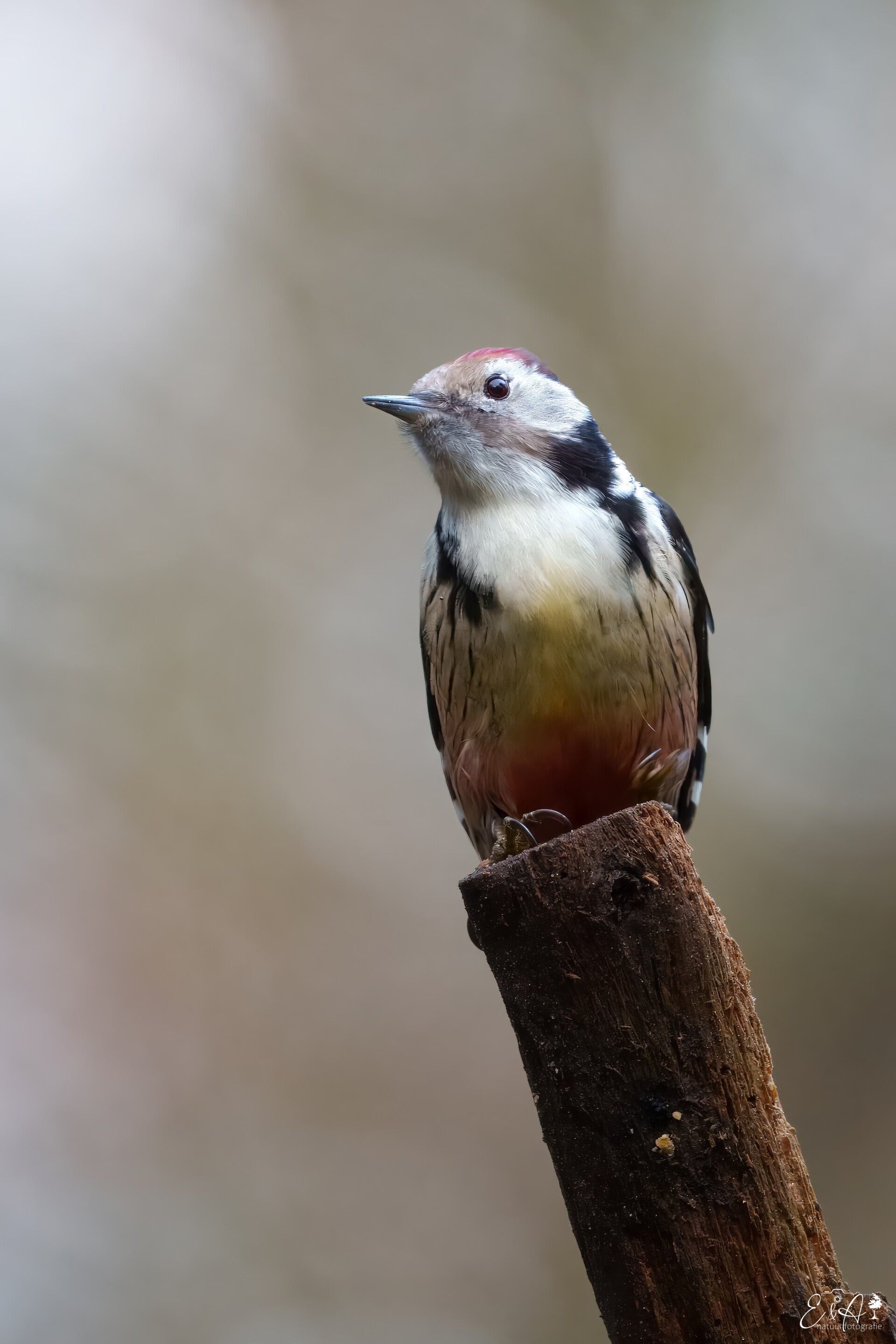 Lijkt op de grote bonte specht maar iets kleiner. Wit gezicht met in wit geïsoleerd oog. Rode pet in alle kleden, niet afgezet aan onderzijde met zwart. Zalmroze 'broek', flankstreepjes. Zwart-witte vleugels met grote witte schoudervlek. Wat verwarrend kan werken met nog niet volwassen grote bonte spechten.