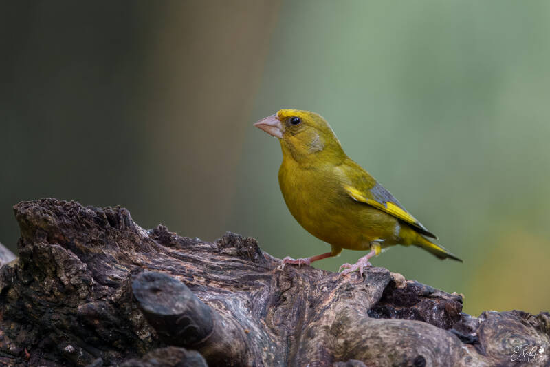 Mannetje helder groen gekleurd met opvallende gele randen van de handpennen en gele buitenste staartpennen. In de vlucht goed zichtbaar. Vrouwtje grijzig-groen van kleur. Stevige kegelvormige snavel. Heeft een wat dikkere kop en lichaam dan verwante vinkachtigen. Juveniel grijzer dan vrouwtje en meer gestreept.