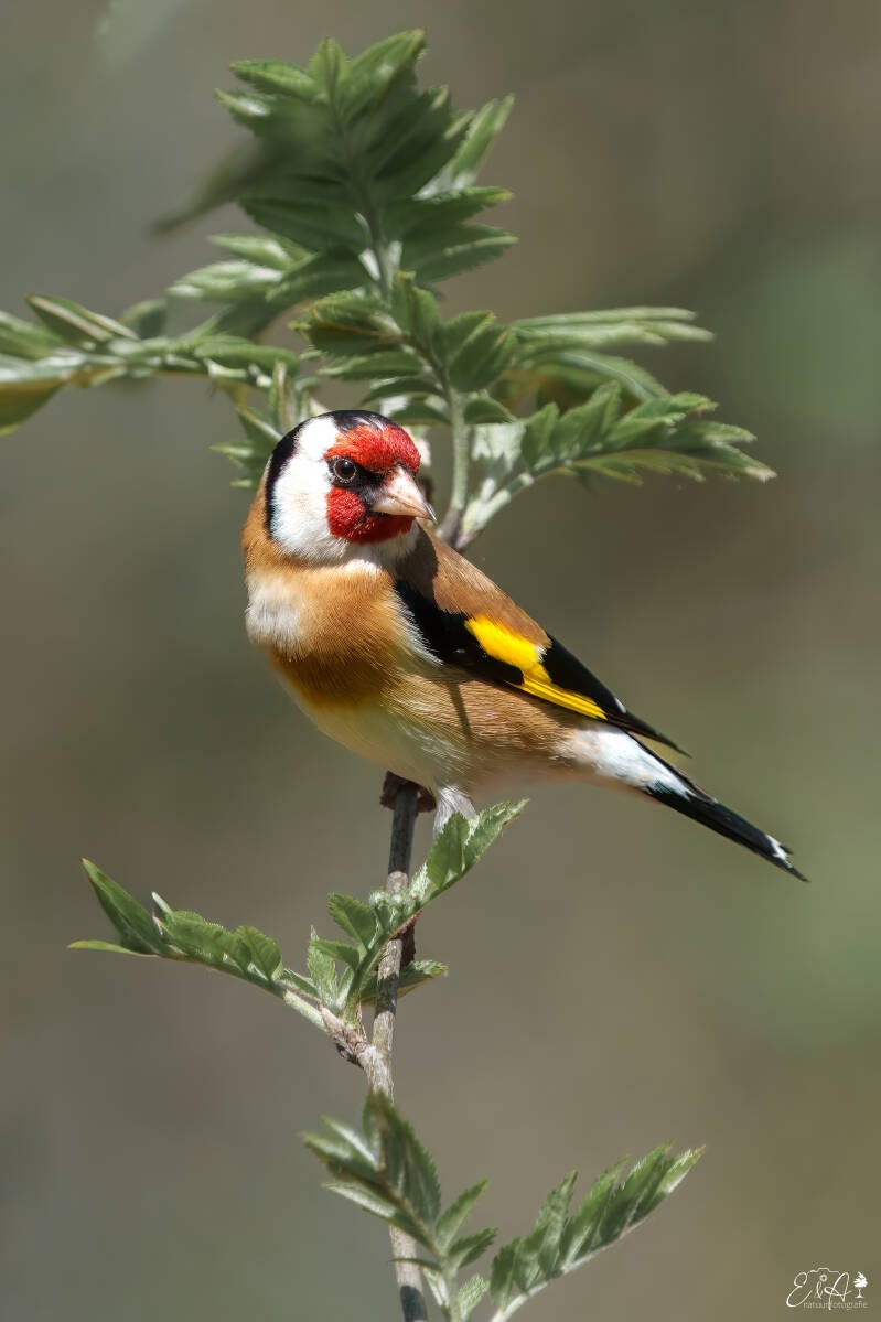 Opvallend kleed met een rood gezicht en een verder zwart met witte kop. Spits-driehoekige snavel (zaden- en insecteneter). De vleugels zijn zwart met een brede gele vleugelstreep, die in vlucht duidelijk opvalt. De stuit is wit en de staart is zwart met witte vlekken. De staart is, typisch voor vinkachtigen, ondiep gevorkt. Bovendelen zijn verder bruin en de onderdelen licht tot wit.